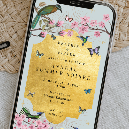 Editable Summer Soirée Invitation – Luxe Gold Foil & Botanical Design